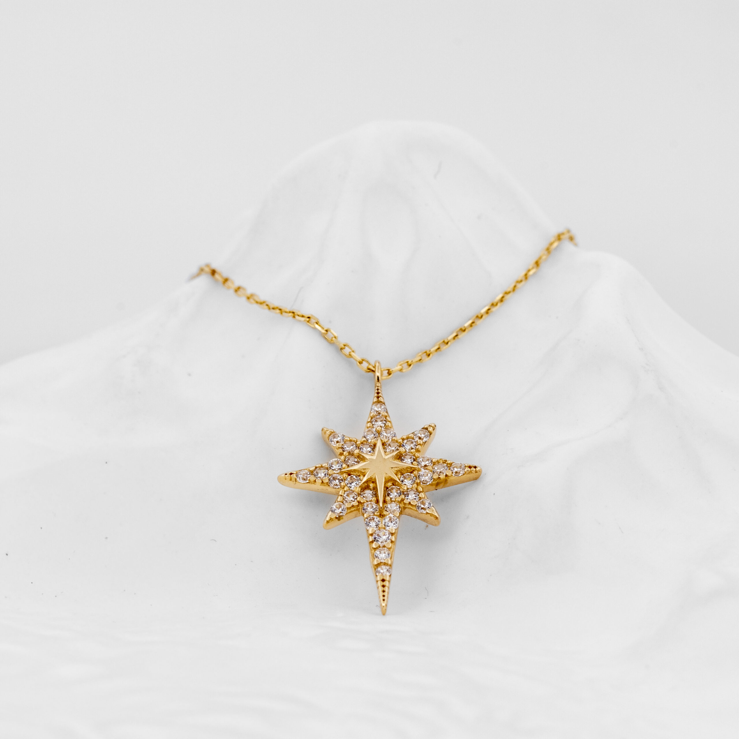 Die „Stellar Brilliance“ Halskette vereint himmlischen Glanz mit hochwertiger Handwerkskunst und besteht aus edlem 585er Gold. Der präzise gearbeitete Sternanhänger ist mit fein gesetzten, funkelnden Kristallen besetzt, die das Licht aus jeder Richtung einfangen und ein strahlendes Glitzern erzeugen – wie ein Stern, der in klarer Nacht besonders hell leuchtet.